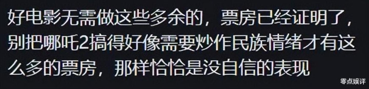 还有人一脸不屑地说,真正的好电影根本不需要这些花里胡哨的操作,票房本身就已经能证明它的实力了。要是把《哪吒 2》搞得好像是靠炒作民族情绪来拉票房,那就太掉价,显得太没自信了。